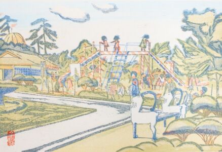 前川 千帆 (まえかわ せんぱん 1888 – 1960)京都府生まれの版画家で漫画家。関西美術院で浅井忠、鹿子木孟郎に洋画を学び、のちに上京。1918年に読売新聞社に入社。漫画を専門に描く傍ら、木版画を製作。清澄な彫摺と躍動感のあるユーモラスな造形により独自の作風を拓く。恩地孝四郎・平塚運一とともに創作版画の御三家と称された。